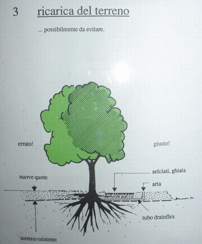7) Nella zona delle radici non è permesso il costipamento nè la vibratura. Usare il rullo compressore solo il minimo indispensabile. Lavori di scavo: la posa di tubazioni va eseguita fuori della zona delle radici. Ricordare che le radici si estendono nella terra tanto quanto la chioma si estende in alto. Vicino alle radici lo scavo va fatto a mano. Le radici fino a 3 cm. di diametro vanno tagliate in modo netto e medicate (usare la poltiglia bordelese o l'argilla). Le radici più grosse vanno sottopassate con le tubazioni senza fare ferite e vanno protette contro il disseccamento con juta o PVC. fig.13/14/15.